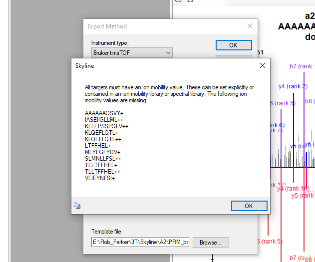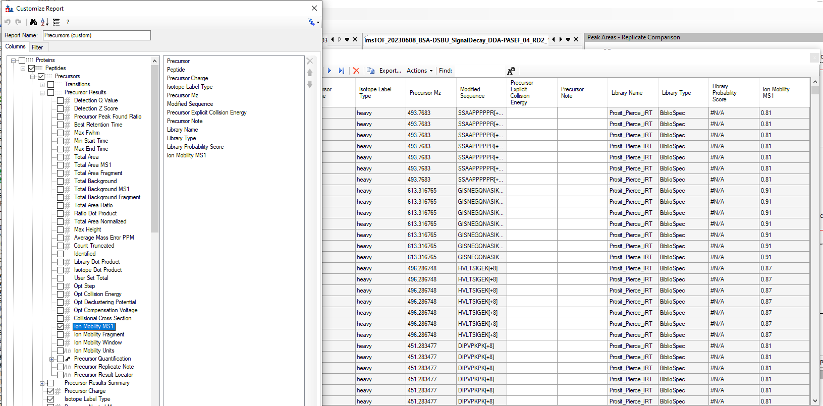 @WeiQiang I have faced the error you had and the way I solve it is by tracking the precursor ions displayed like in the image Robert showed. But you can also create a custom precursor report (see attached figure) to track precursors that are missing IMS values. Perhaps you have some iRT peptides that are not reported in the spectral library?