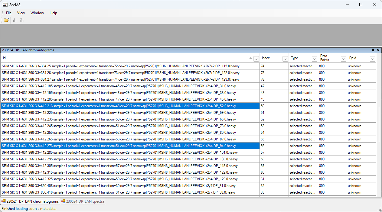 When I use SeeMS.exe to look at the chromatograms that are in the wiff file, the chromatogram names have all been rounded off to two decimal places, which is probably to be expected, and so I see chromatograms going from 1166.42 to 1166.56, except that 1166.50 is missing.