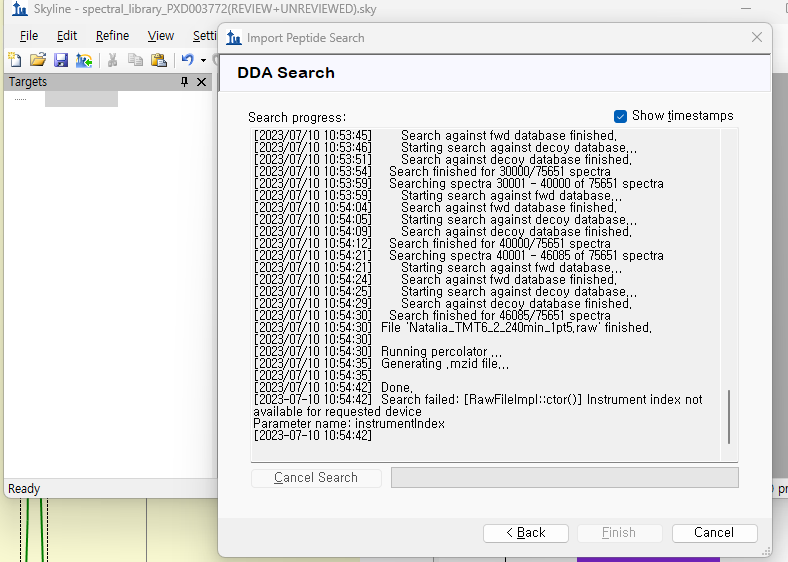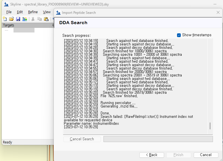 We would like you to send us your Skyline document, some of your .raw files, and the FASTA file that you provided to the "File > Import > Peptide Search" wizard.