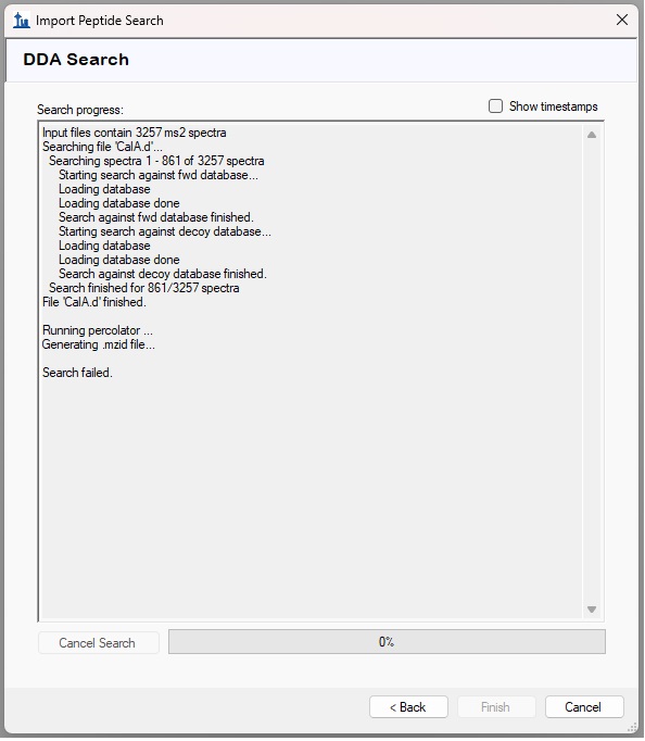 I think in some of these cases the reason that the search failed was that the FASTA file was much too small. I am not sure what the minimum size of the FASTA file should be, but I imagine it should be a few hundred proteins at least.