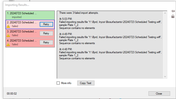 If you would like, you could send us your .wiff files and the .wiff.scan files that go with them. It might help me to come up with a better fix if I could see your data files. Also, it's conceivable that you might be running into a different error, in which case the fix that I am planning for the zero length chromatogram bug won't work.