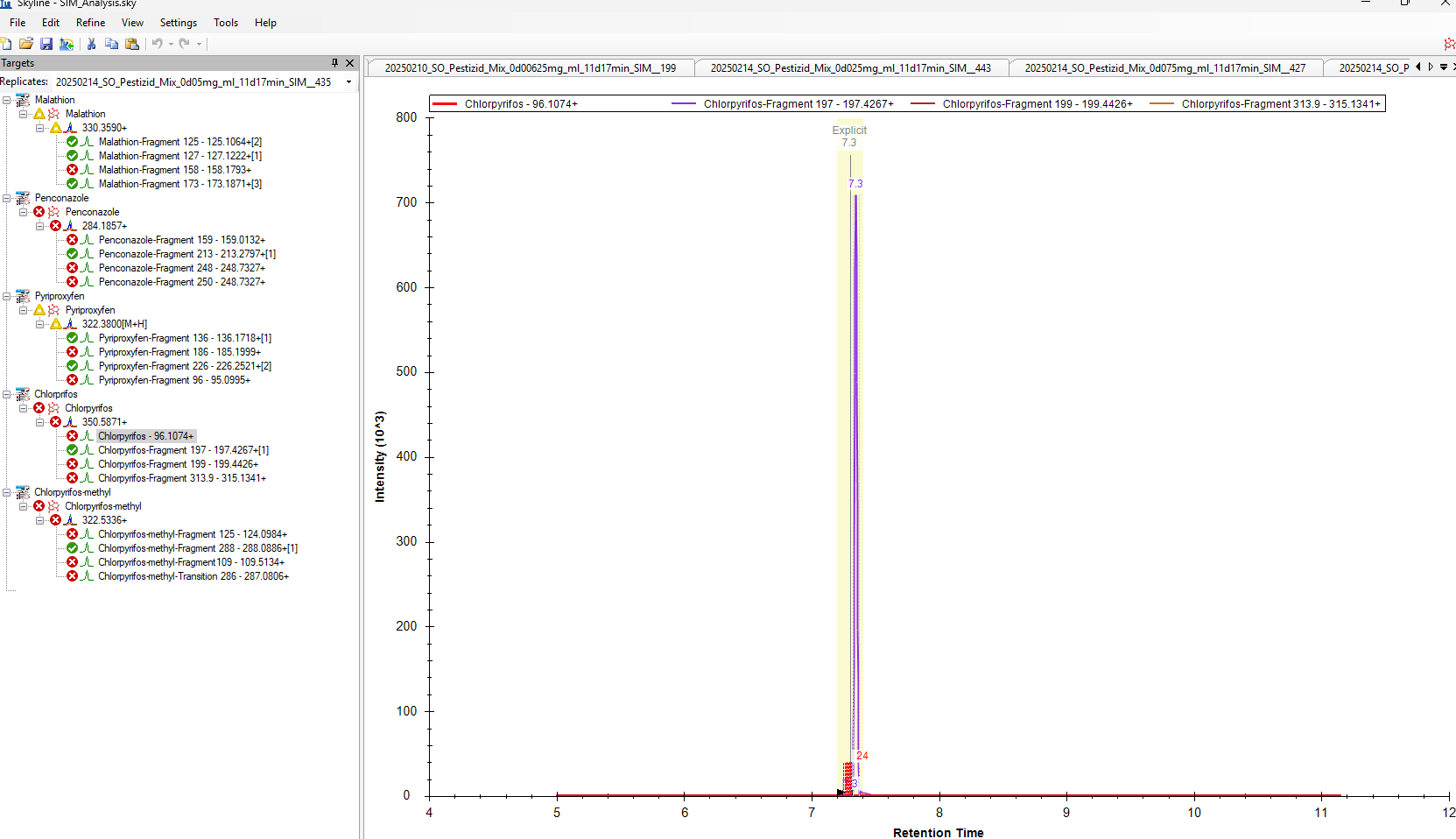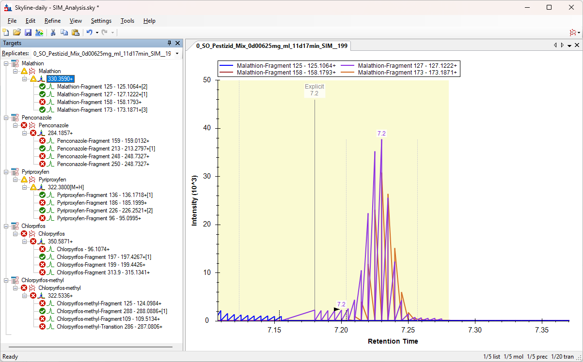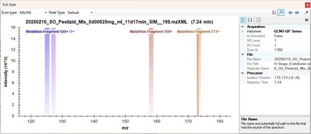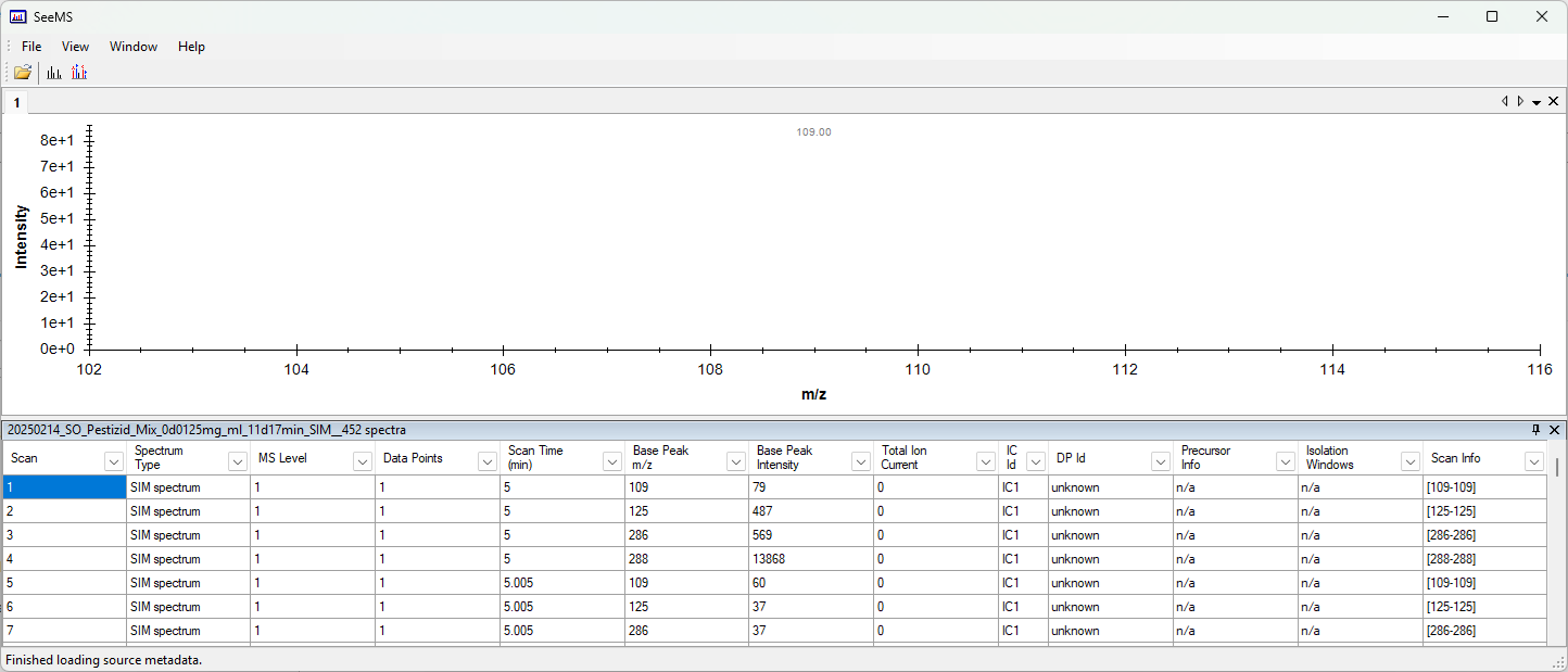 I tried to import SIM-Data files, but only a few of the m/z were found (see attached screenshot). The full-scan files, on the contrary, can be perfectly imported and do show peaks. The SIM files are in the uploaded zip-folder "GCMS_Sim". I asked more experienced colleagues and we tried many different settings but the m/z of many molecules and their fragments cannot be found.
