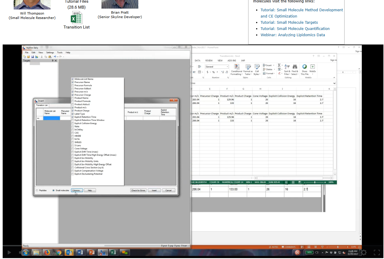 there are some other difficulties. I attach here the picture 1. I have different names of the several molecules, and one of them have the same IS (for example: C18,C18OH, C18:1 molecules have IS named C18IS. or ASA,Arg is using ArgIS as IS). in that case in its impossible to label them the same name, because there are more of two of them. I tried grouping them in one list but it didnt help, making notes (note in the transition list doesnt exist in the report columns), either video-tutorial didnt help (https://skyline.ms/project/home/software/Skyline/events/2017%20Webinars/Webinar%2016/begin.view?, pic 2). In this video there are some options and buttons in transition list, that we dont have (for example, "columns" button and "precursor name" column option) (pic 1 and pic 2)... I even downloaded skyline daily but there is no such options as well. could you reccommend anything?