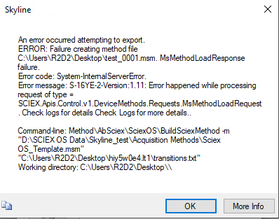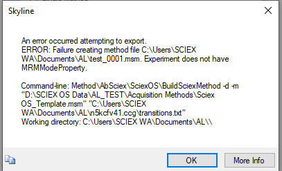 Hello Team Skyline, I am currently trying to export CE optimizing methods for 2x Sciex Qtrap systems (6500+). Both systems got Skyline installed on their own individual PCs. When I try to export CE optimizing method using Skyline, I am getting two different errors from each Skyline (please find attached). I have fed in the same transition list, both have the same transition settings, and I selected the same export method settings. Any idea on how to fix this? FYI, I do not have any problem exporting them as transition lists. Thanks a lot for your time. Kind regards, |