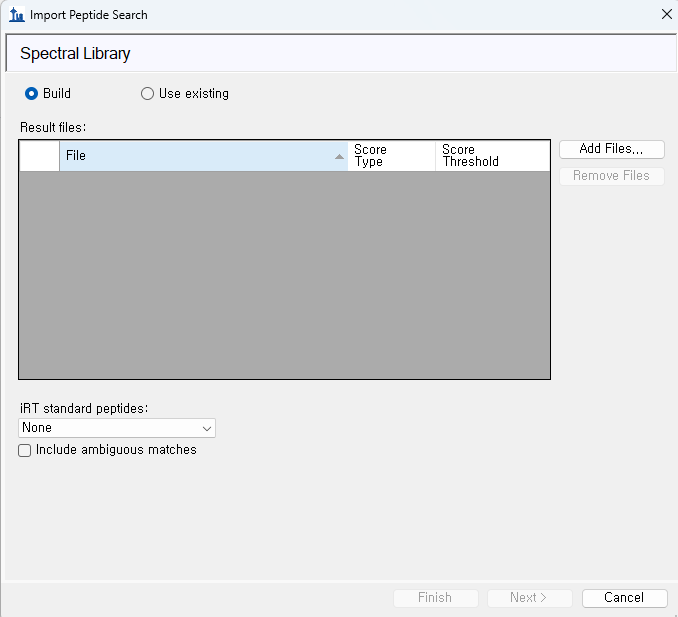 1. Use the "Build" button on the "Library" tab at "Settings > Peptide Settings" to build a spectral library