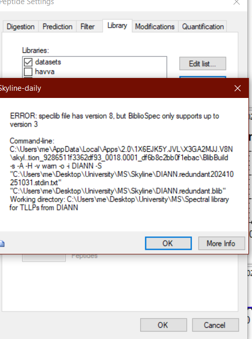 I tried to build the spectral library using DIA-NN on skyline, and received the attached error. I am wondering how to resolve this problem.