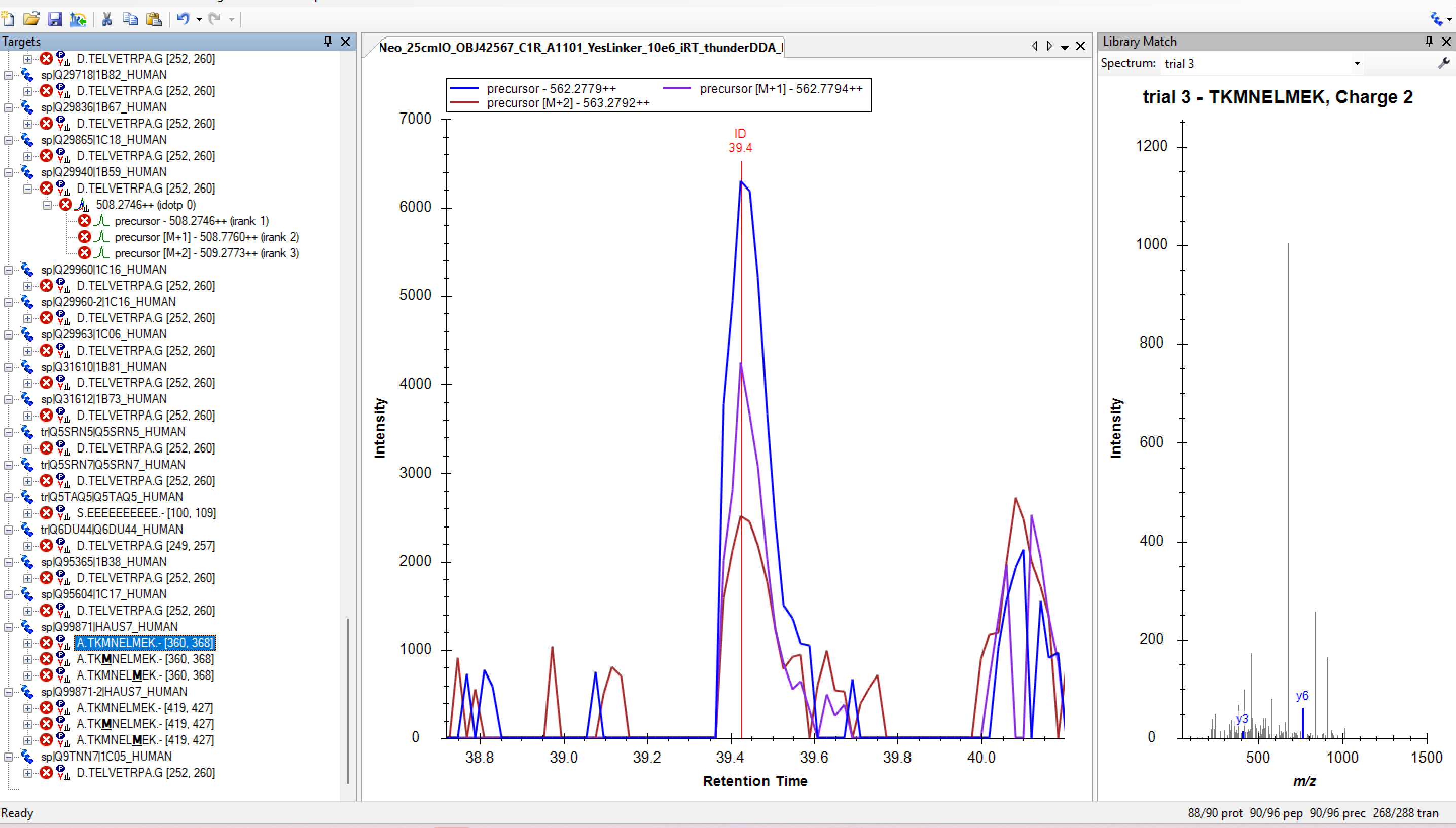 Note that all of the spectra in the spectral library are wrong. That is, if you look at the spectrum in Skyline, very little of the signal could be matched to the name of a fragment ion.