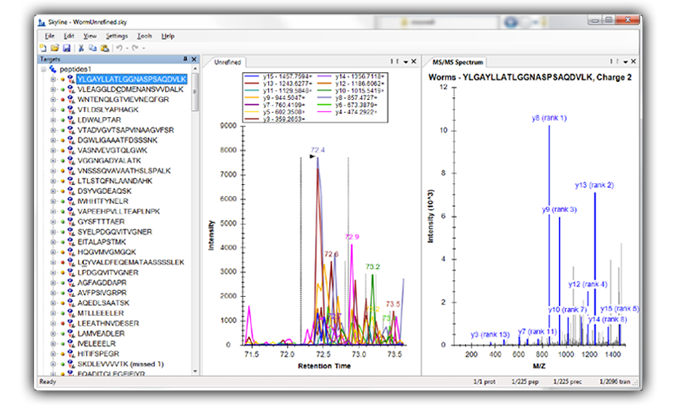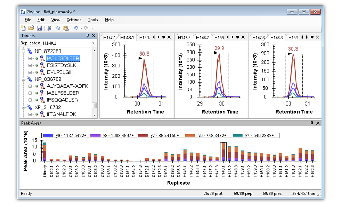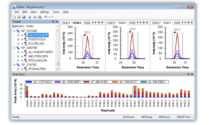 Tutorial: Existing & Quantitative Experiments Work with quantitative experiments and isotope labeled reference peptides, by starting with experiments with published transition lists and SRM mass spectrometer data. Learn effective ways of analyzing your data in Skyline using several of the available peak area and retention time summary charts. (43 pages)