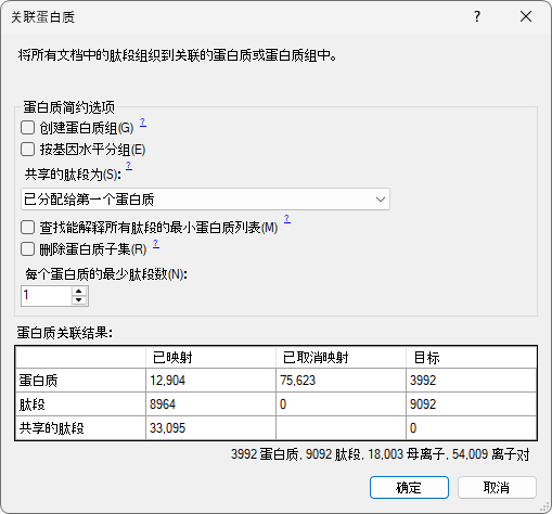 Skyline 可将匹配同一组肽段的蛋白质合并成蛋白质组,找出能解释所有肽段的最小蛋白质列表。在此文档页面,可以阅读有关蛋白质分组和简约蛋白质推断的更多信息:Skyline 蛋白质关联 。在本教程中,没有选中创建蛋白质组和查找最小蛋白质列表的相应复选框。