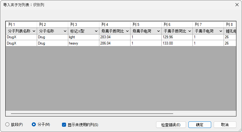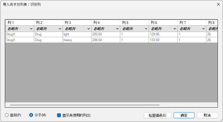 Skyline 将显示导入离子对列表:标识列表单,从中可以告知 Skyline 每列的含义。