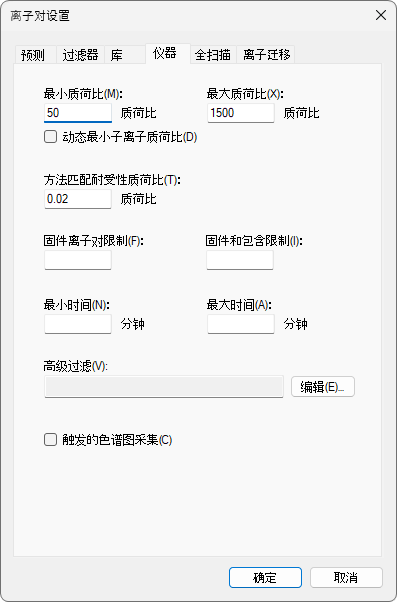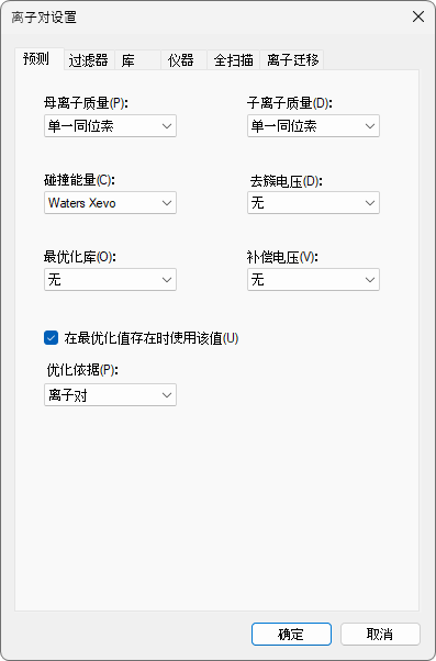 仪器选项卡中的默认值适用于本实验。但在您自己进行实验时,请确保最小和最大质荷比值对您实际使用的仪器是有意义的。这些设置的目的是防止您添加质谱仪实际上无法测量的目标离子对。