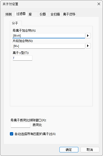 在离子类型字段中,值“f”表示将仅测量碎片离子的离子对。如果还想测量母离子,则可以使用“f,p”。