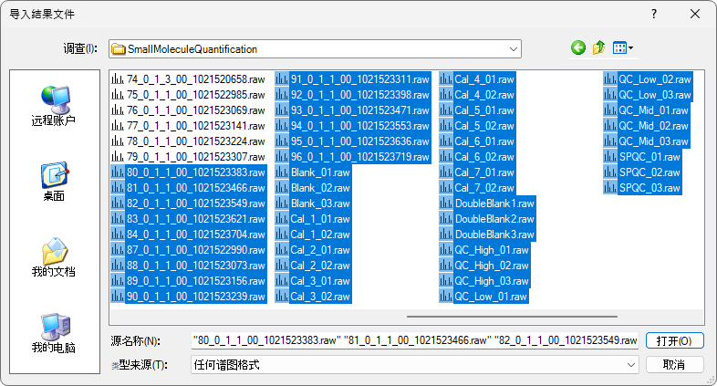 本实验有 113 个相关的质谱仪数据文件。在这种情况下,起初只导入少量未知样品以及所有标准曲线数据和质量控制 (QC) 数据会很有用。但是,您可能还希望从不太复杂的文档开始验证数据质量,仅导入几次分析结果即开始验证,比如从最高浓度的标准曲线开始。
