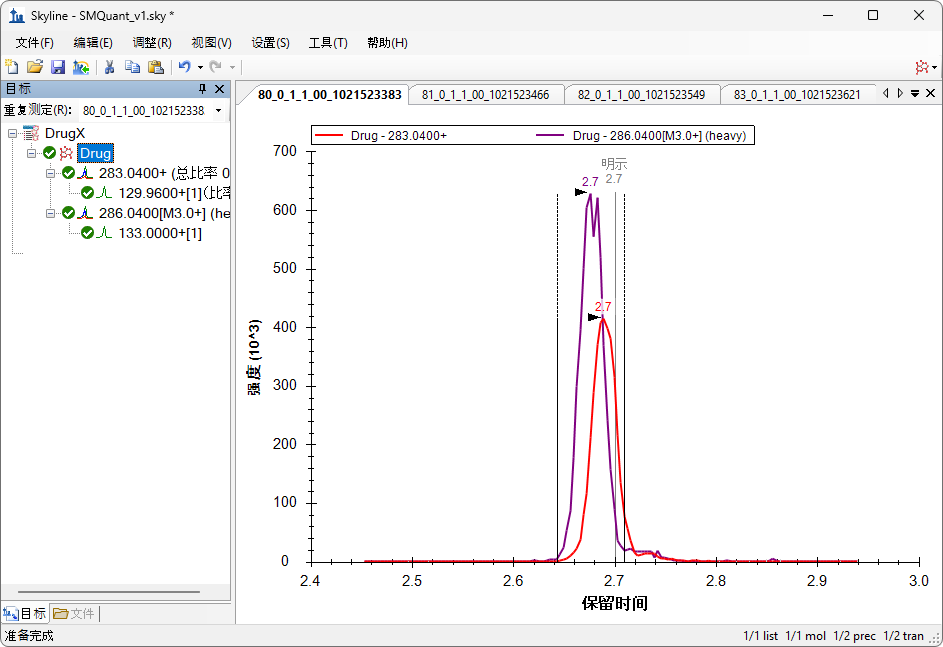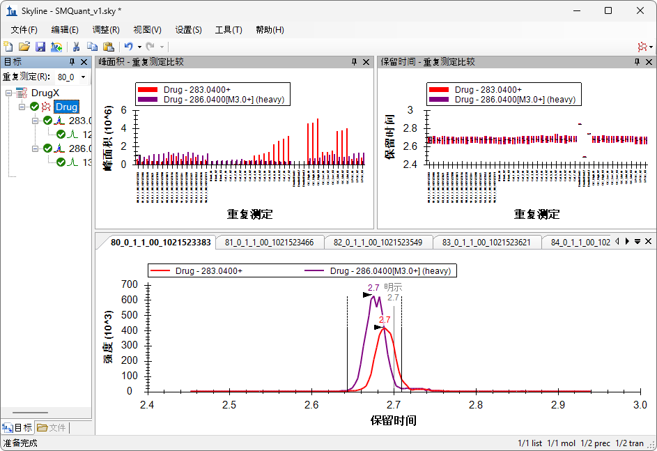 本研究只有两个研究目标:一个小分子,一个内标。内标是该小分子的同位素标记变体,与目标小分子在色谱上共洗脱。将一个不相关的小分子设置为替代标准品,也可以在不相关的小分子之间建立关系。Skyline 高分辨率代谢组学教程中介绍了替代标准品方法。