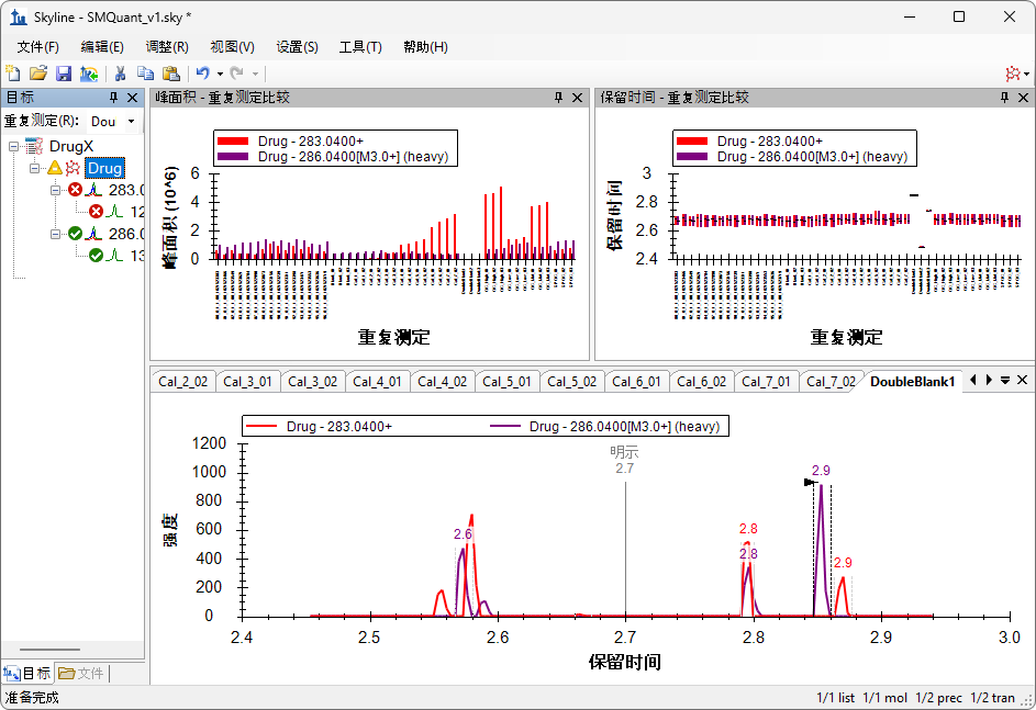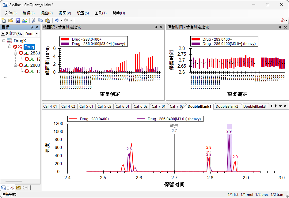 Skyline 其实并不会为该重复测定中药物的轻/重离子对找到一个良好的峰,因为“DoubleBlank”一词表示二者在该样品中都不存在。色谱图现在显示了 Skyline 不得不选择的色谱峰: