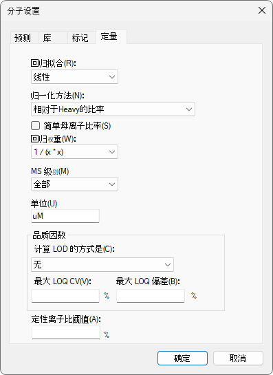 本实验使用线性回归拟合,对重标药物实施归一化。Skyline 提供了曲线随 x 而变化的权重选项:无、1/x 和 1/(x*x)。本教程使用“1 / (x*x)”的回归权重,这会增加较低浓度校准样品的权重。单位的设置只是为了展示结果,可以设置为对您的实验有意义的任何单位。本实验中的浓度为微摩尔每升,因此单位字段设置为“uM”。