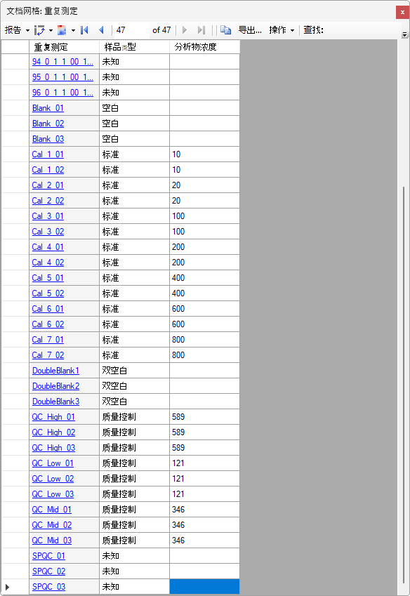 记住,“SPCQC_”重复测定是质量控制样品(混合了每一份样品的一小部分),因此将其保留为“未知”。