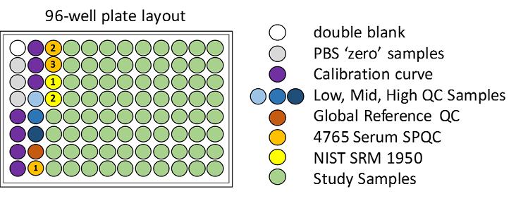本实验根据《FDA 生物分析方法学确证指南》设计而成,因此所包含的不仅仅是研究样品。此类研究所采用的常见检测板样品布局和分析顺序的完整描述现在已经发布(https://www.ncbi.nlm.nih.gov/pubmed/29039849)。简单来说,该数据集的样品按如下方式分布在 96 孔检测板中:
