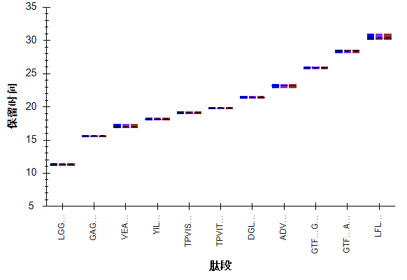 上图呈现了30 分钟梯度条件下,每条肽段平均洗脱时间的整体视图。执行以下操作继续查看数据: