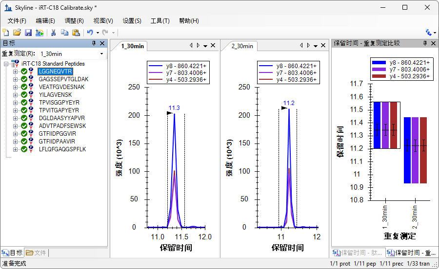 使用向下箭头键分别查看 Biognosys 标准肽段混合物中的 11 个肽段,确保整合正确无误,并且两次重复测定均在相似的保留时间出现色谱峰。其实,自动整合非常适用于这些肽段,您不必做出任何手动修改。本教程仅包括两次重复测定。如果您自行校准新的 iRT 计算器,可能需要使用更多次重复测定来改善对肽段平均保留时间的估计。在要 Skyline 使用结果来校准保留时间计算器时,Skyline 将使用每个肽段多次测量的平均值,这些值根据肽段的真实保留时间进行估计,其精度与测量次数的平方根呈正比。