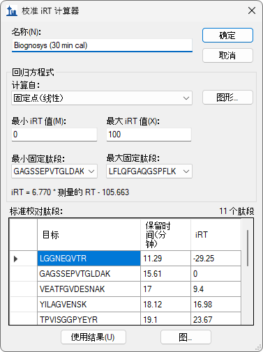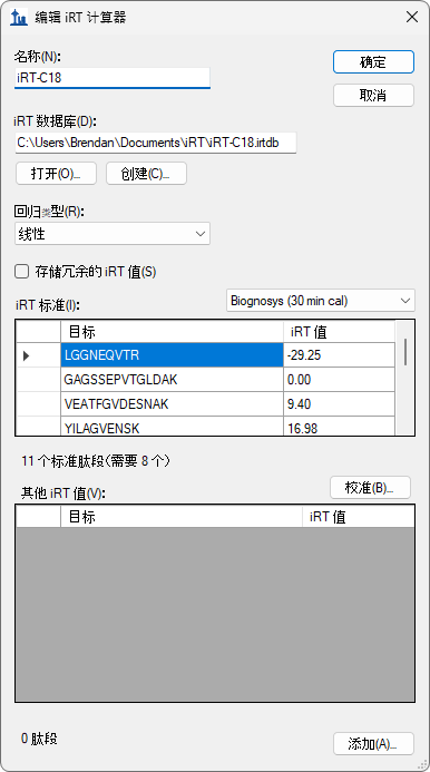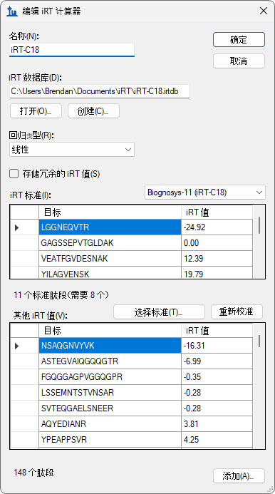 您也可使用编辑 iRT 计算器表单中的选择标准按钮,将标准肽段更改为数据库中包含的任何肽段集合,并且可以使用重新校准按钮更改 iRT 标尺。