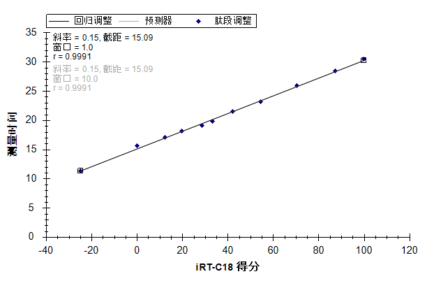 注意:这仅仅是 Biognosys 定义 iRT-C18 标尺的方法。在定义您自己的标尺时,可以将固定点保留为第一个和最后一个洗脱肽段,也可以使用您所选择的其它任意肽段。也就是说,固定点和标尺的选择具有一定的随意性。因此,您可以定义与任意时间都无关的相对保留时间标尺,然后将其余 iRT 值映射到该标尺上。