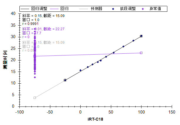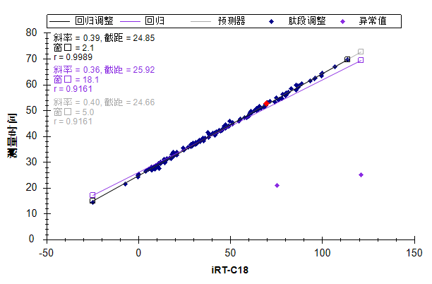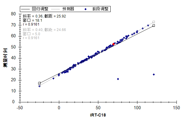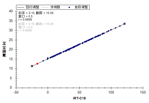 在图的左上角,可以看到 Pearson 相关系数为 0.9991。如果在 x 轴下方未看到 iRT-C18,则需要执行下列操作:
