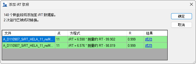请注意,在对这两次运行生成 iRT 值时,Skyline 会为每次运行分别执行线性回归,然后使用每次运行的线性回归,来计算该次运行中的肽段的 iRT 值。如果多次运行中包含相同的肽段,Skyline 将采用多次计算得出的 iRT 值的平均值。与直接计算物理保留时间平均值的方法不同,这种方法允许多次运行之间的梯度变化。单击网格结果列中的超链接文本“成功”,可以查看这两次运行中的回归图。