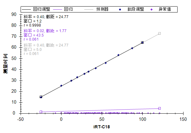 非预定模式实验方法有一个缺点:每次色谱条件变化时,都可能需要进行许多质谱实验来确定预定方法,无论这样的色谱条件变化是来源于不同实验室之间的方法共享还是实验室内部的不同仪器,又或者是实验过程中同一台仪器上仅仅是色谱分离柱的变化。比如在 MacCoss 实验室的一次实验中,为了完成在一次实验中对 780 个离子对进行预定采集的 45 次重复测定,总共进行了 5 次非预定采集。在 NCI-CPTAC 验证研究小组进行的一次实验中,为了完成在一次实验中对 750 个离子对进行预定采集的 150-200 次进样,总共进行了 6 次非预定采集,因为这项研究涉及 11 个实验室中的 14 种仪器,并且一些实验室还采用了不同的色谱柱条件来完成足够的进样。显然,如果一项技术能够将此前已经测定的肽段保留时间存储用于各实验室、仪器平台或者在梯度变化时仅需一次校准,则会极大地简化靶向实验中所使用的预定方法的生成过程。