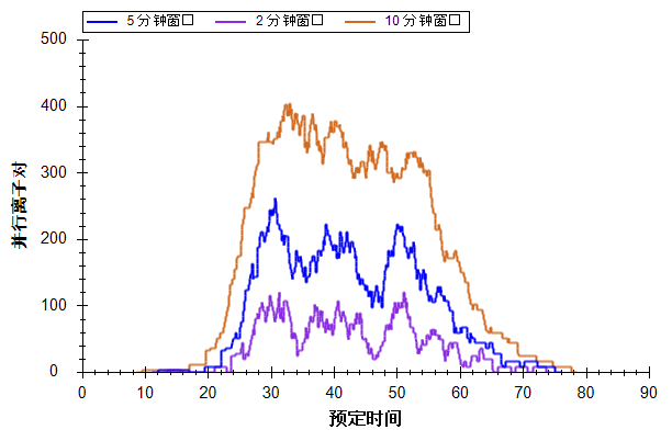 从此图可以看到窗口大小对于预定方法的影响。时间窗口越小,则在给定时间内允许同时测定的离子对越少,这使得能够在特定驻留时间内,对单次进样中的更多离子对进行测定。捕获整个色谱峰的目标肽段百分比所需的窗口大小通过以下公式进行近似估计:
