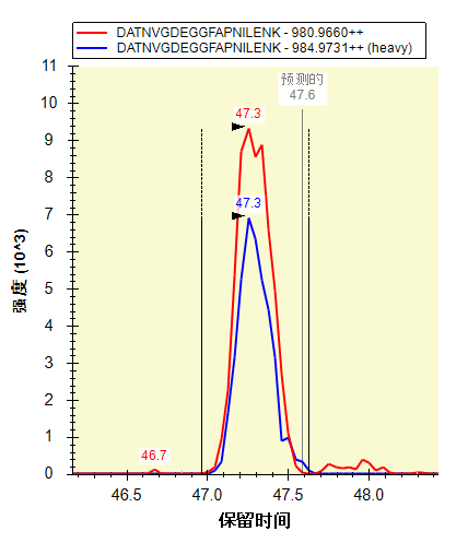 您会看到除标准肽段以外的所有肽段都具有轻标母离子对和重标母离子对,并且相比非预定数据,每个色谱峰的点通常更多。您还会看到 Skyline 在标记“预测的”注释下方显示了色谱峰的预测时间。