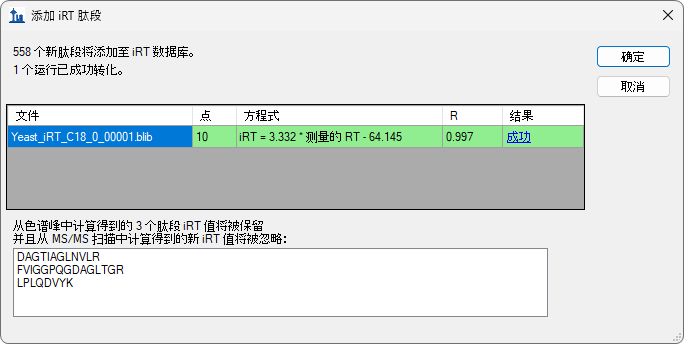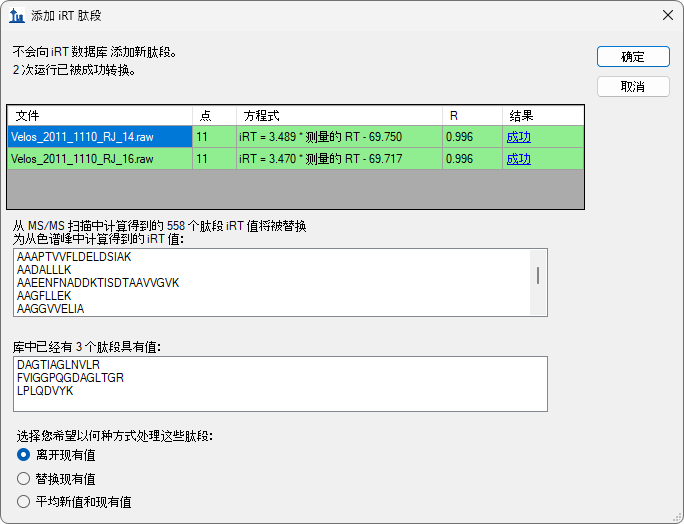 系统将替换您在上一部分添加的 558 个 iRT 值。由于您在使用色谱峰时间,因此还可以选择更换酵母和人类样品共有的 3 个肽段,或使用两者的平均值。