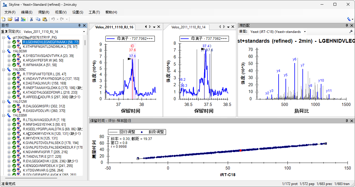 在测试 Skyline 中的 iRT 支持数据时,利用了 PeptideAtlas 中的公共数据来创建上面这样的 Skyline