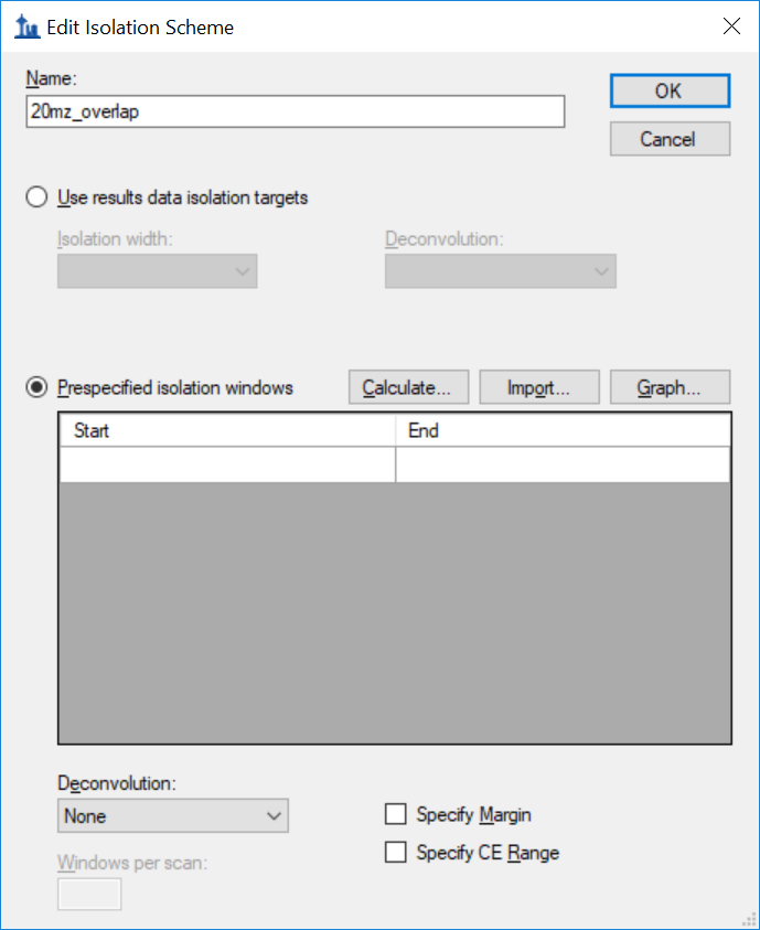 - In the Edit Isolation Scheme dialog, enter a name for the Isolation scheme such as '20mz_overlap' and then click the Prespecified isolation windows radio button.