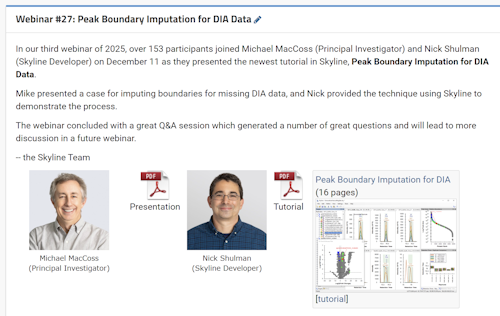 Tutorial: Peak Boundary Imputation for DIA Get hands-on experience using the Skyline peak boundary imputation feature for DIA experiments. Learn how missing values affect group comparisons in untargeted proteomics, explore the limitations of zero-substitution approaches, and see how Skyline transfers peak boundaries from high-confidence identifications (exemplary replicates) to replicates with missing peaks. Use the Score to Run Regression graph to understand retention time alignment and identify cases where imputation may not perform well. (16 pages)