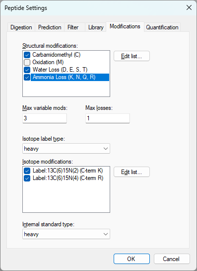 The other thing that you should do is tell Skyline about the modifications that you are using, which, in addition to C[+57] are Oxidation (M), water loss, ammonia loss, and the K and R heavy modifications. See attached screenshot "ModificationSettings.png".