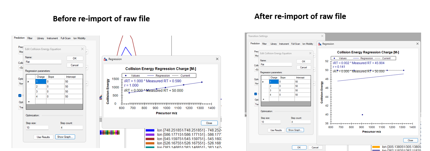 In your "beforeReimport" Skyline document, the collision energy equation that is selected on the Prediction tab in Transition Settings is currently the one called "Flat". However, that only actually affects results that you may import in the future.