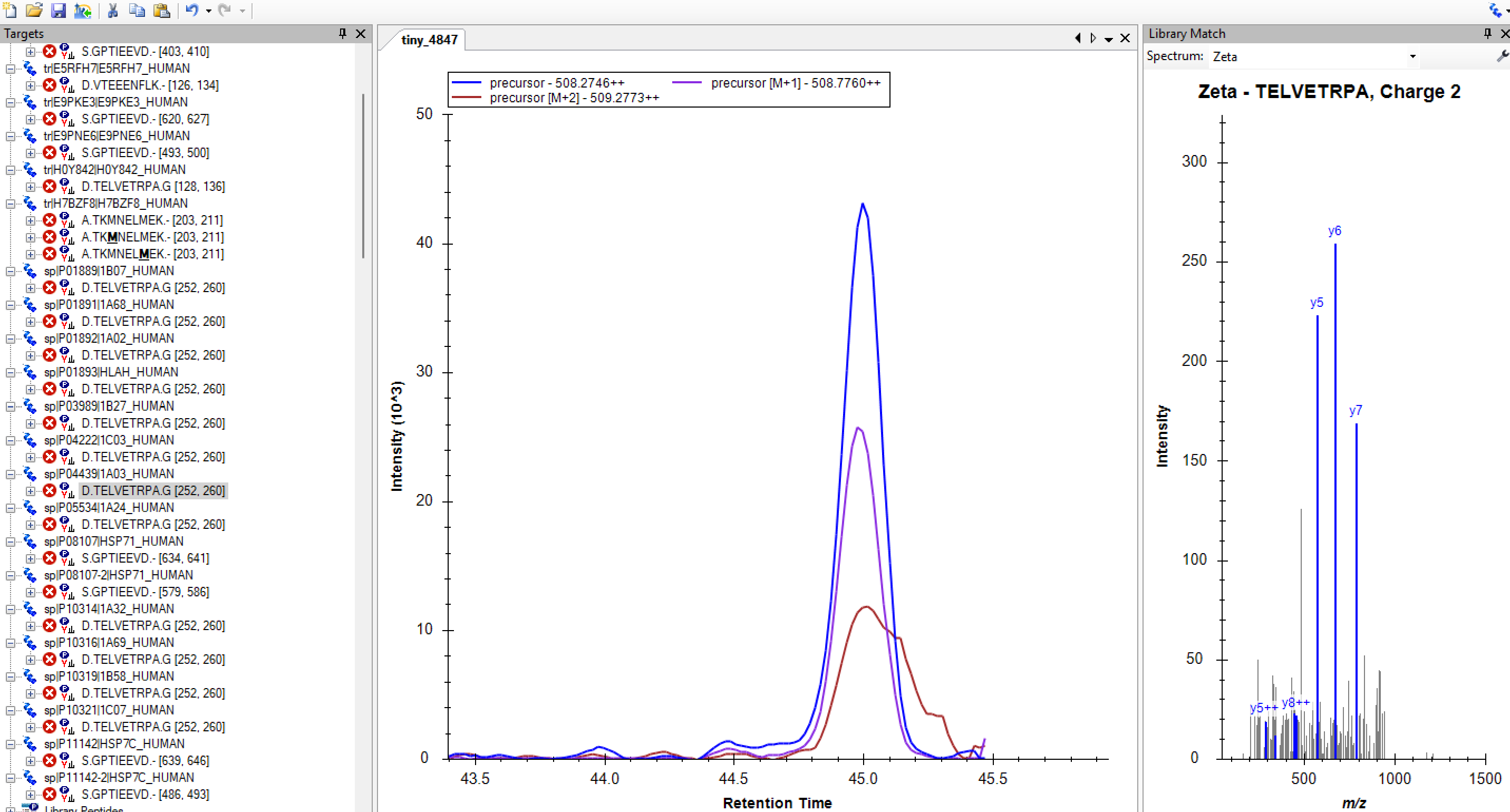 Note that all of the spectra in the spectral library are wrong. That is, if you look at the spectrum in Skyline, very little of the signal could be matched to the name of a fragment ion.