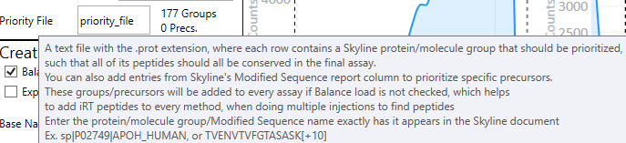 You'll either want to use the Protein name that Skyline has put into the Protein column if you go to the standard Protein report, or Molecule List name in small molecule mode. Or you can use the precursor name, found in the columns Modified Sequence Monoisotopic Masses or Molecule, for Proteomics or Small Molecule mode, respectively. You'll know if an item got found and prioritized because the UI will write how many Groups (proteins, molecule lists) or Precs. (Modified Sequence Monoisotopic Masses or Molecule) got found and prioritized. The count of Precs. is different depending on if you have Balanced Load checked or not. If it's checked, then Precs is >0 only if you included a precursor name in your file. If it's not checked, it looks like it will also include the count of precursors belonging to your prioritized proteins. That may be a little confusing actually, we could change that.