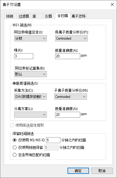 对于大多数胰蛋白酶肽段,前 3 个同位素峰强度最高。您还可以使用基于基本(最强)同位素峰百分比的强度阈值,但这些设置对于胰蛋白酶肽段而言应是合理的默认值。