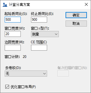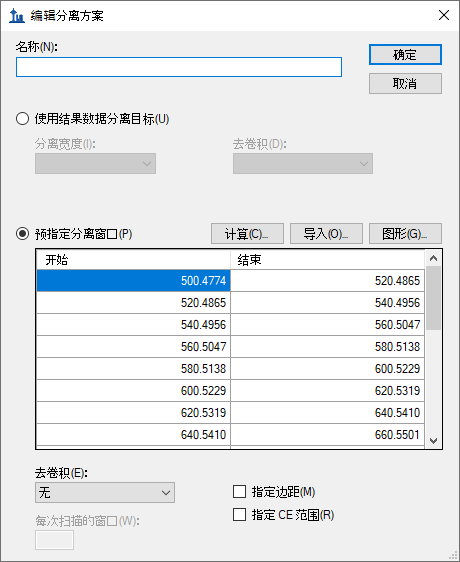 这将启用从中指定分离窗口的网格。您可以在网格中手动输入窗口边界,但由于本例中窗口边界的循环非常规律(从 500 到 900 质荷比,以 20 质荷比为增量),因此可采取一种更快捷的方法来指定边界: