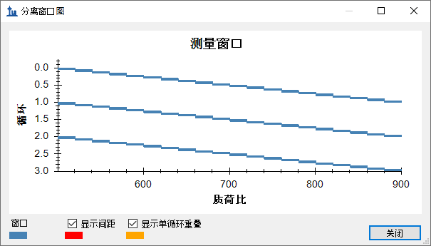 您应当看到分离窗口的周期随时间推移而变化的图形,其中 Y 轴表示周期/时间,X 轴表示质荷比: