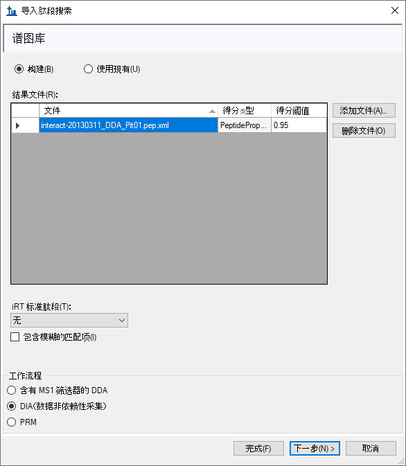 对于该数据集,得分阈值字段设置为“0.95”,表明 PeptideProphet 得分为 0.95 或更高的肽段谱图匹配项将包括在内,因为 DDA 数据采用 TPP 处理(在使用 SEQUEST 进行肽段谱图匹配之后)。对于可重用的库, 可能要使用更严格的阈值,如 0.99(即 ≤0.01 或 q 值错误发现率为 1%)。