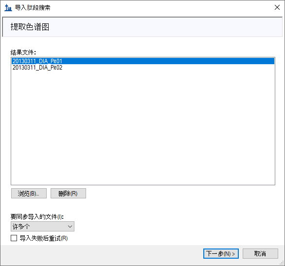 Skyline 建完谱图库后,所有与串联质谱谱图匹配的肽段及其 DDA 运行的保留时间都可以包含在您的 Skyline 文档中。但首先会显示提取色谱图页面,从中可以告知 Skyline 在哪里找到将用于色谱图提取、峰检测和峰面积计算的 DIA 数据文件。