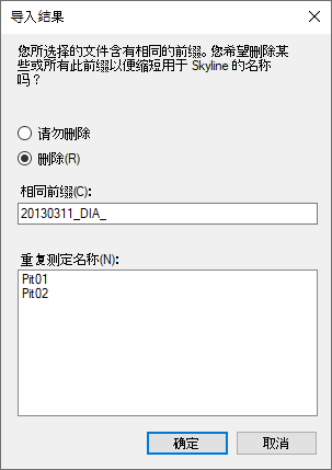 Skyline 会显示一个表单,询问您是否移除相同前缀“20130311_DIA_Pit0”,这样 Skyline 界面中显示的重复测定名称将更短,并且通常更易于使用。但在本例中,名称将缩短为“1”和“2”。