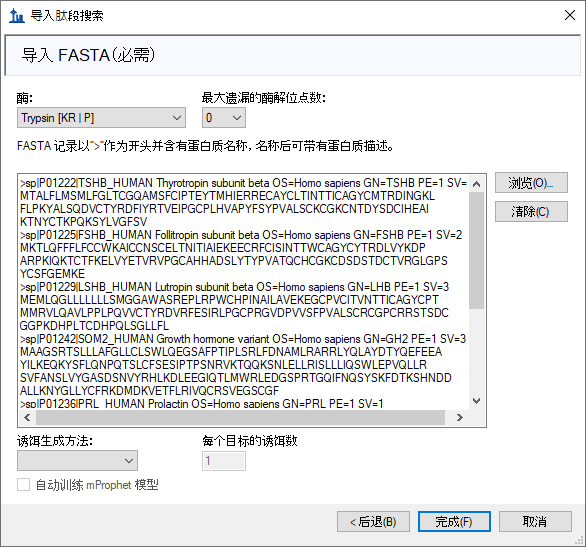 随即进入导入 Fasta页面,其中要求您以 FASTA 格式指定所要针对的蛋白质以及用于将它们消化成肽段的蛋白酶,您可以将其保留为默认胰蛋白酶,且不允许任何遗漏的酶解位点数。