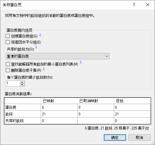 Skyline 将显示一个表单,告知您它将添加 6 个蛋白质和 21 个肽段,涵盖 25 个母离子和 225 个离子对。对于每个蛋白质,此列表仅包含谱图库中存在的肽段。