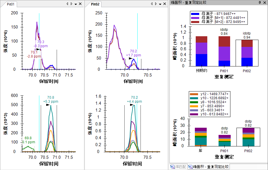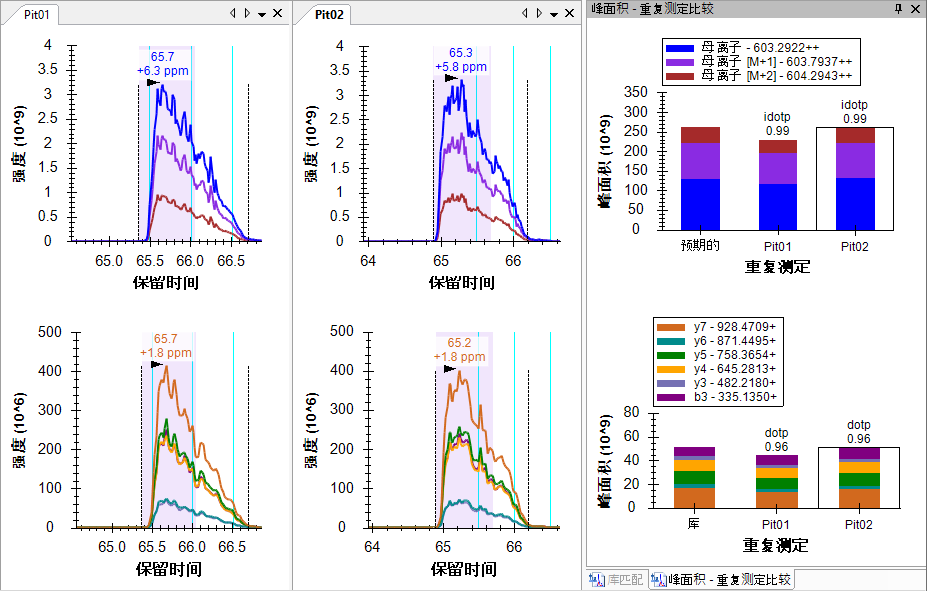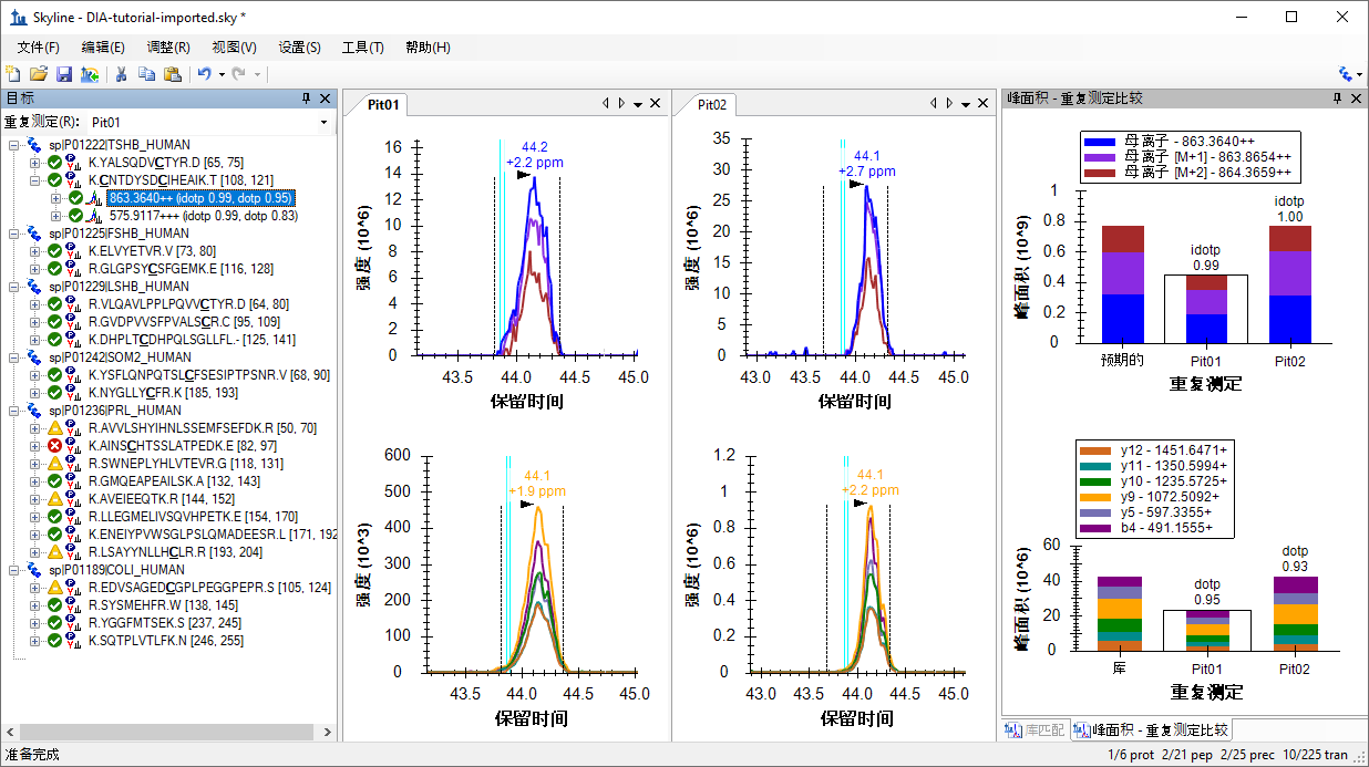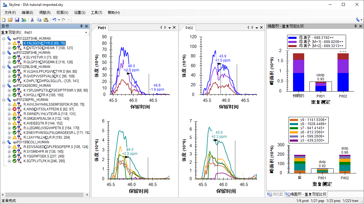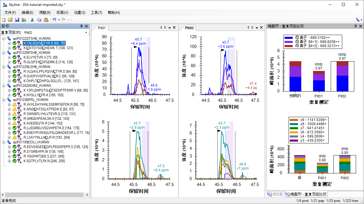 对于此母离子而言,您在最后一个肽段上引入的所有指标,即质量误差、同位素点积和点积,看起来更好。您可能会觉得应选择不同的积分边界,尤其是在“Pit02”中的峰上。您可以试一下,然后使用 Skyline 撤销/重做按钮证明它不会对峰面积产生太大影响。除非积分边界缺少大部分的峰,例如在第一个肽段中,否则通常最好接受这样的细微差异。