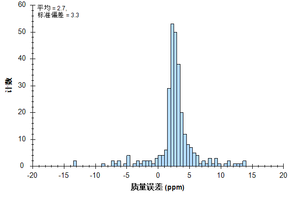 在包含更多目标的文档中,可能不必执行第二步来了解质量误差分布,仅使用每个肽段母离子的最强离子对。但在本例中,为了让您更准确地判断分布,现在应当显示如下: