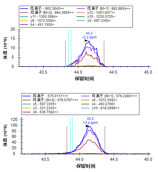 这两个母离子都有良好的共洗脱碎片离子色谱图,并且无明显干扰。它们在 MS1 色谱图左侧也表现出明显干扰。
